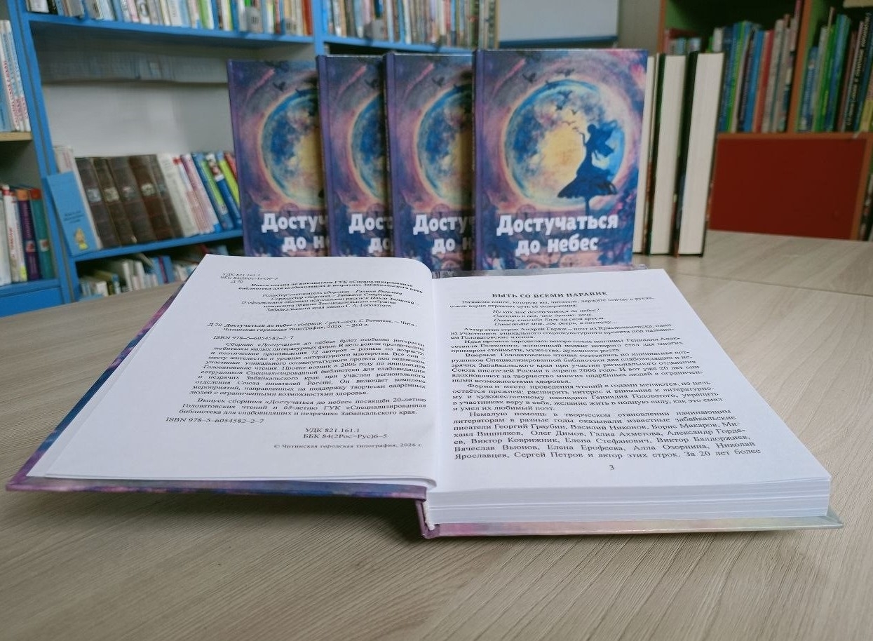 ✍В год 20-летия литературного проекта «Головатовские чтения», ориентированного на талантливых самодеятельных авторов из числа людей с ограниченными возможностями здоровья, и в честь 65-летия «Специализированной библиотеки для слабовидящих и незрячих» Забайкальского края, мы рады представить наше новое многоформатное издание – сборник «Достучаться до небес».